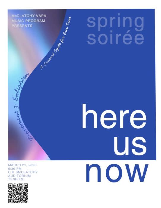 Music lovers and supporters of music education are invited to the McClatchy High School Music Program’s third annual Spring Soirée fundraiser in the school’s L Quad and auditorium. This adults-only event features a silent auction, hors d’oeuvres, mocktails, and chamber music performances by the program’s students. The event culminates with the premier of the program’s next installment of its ambitious four-concert cycle, Here. Us. Now. Movement 3: Enlighten. Come support music education at McClatchy High School!