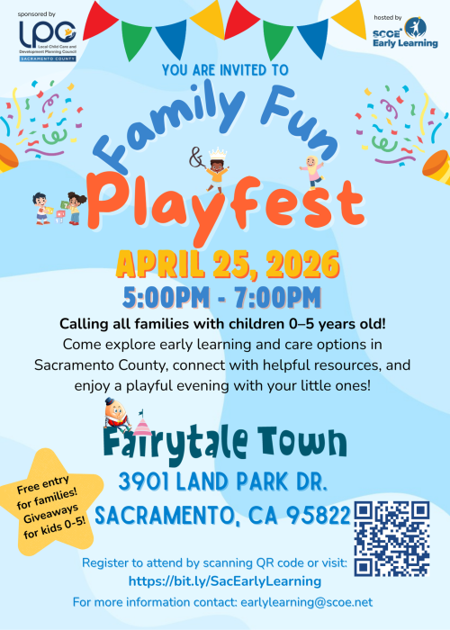 Finding the right early learning program for your child is one of the most important decisions a parent can make. To help you navigate your options, we are excited to invite you to the 3rd Annual Family Fun & Playfest. Hosted by the Sacramento County Local Child Care and Development Planning Council and SCOE Early Learning, this event brings together the best of Sacramento County’s early learning and care programs in one magical location—Fairytale Town! Why Attend? Discover Options: Learn about local early learning & care programs to find the perfect fit for your child. Get Support: Connect with community organizations providing resources for health & wellness, housing, food, and more. Have Fun: Enjoy a wonderful evening at Fairytale Town! Families interested in attending can register here: https://bit.ly/SacEarlyLearning Watch our outreach video here: https://www.youtube.com/watch?v=MIbYGdLNBT8 Download the event flyer: https://drive.google.com/drive/folders/15f6957gH1I8yaM4At7qGeO1Zw4VMiKay?usp=sharing We look forward to seeing you there!