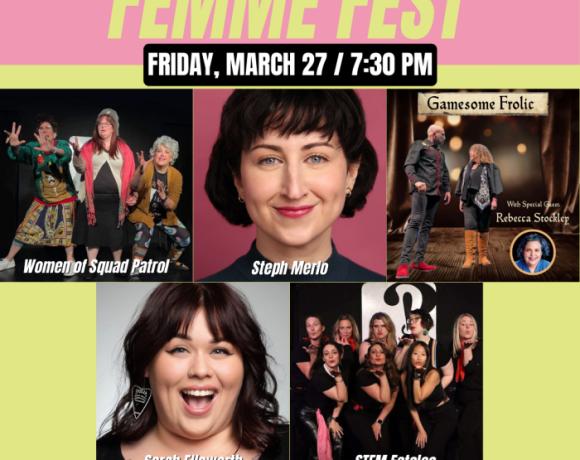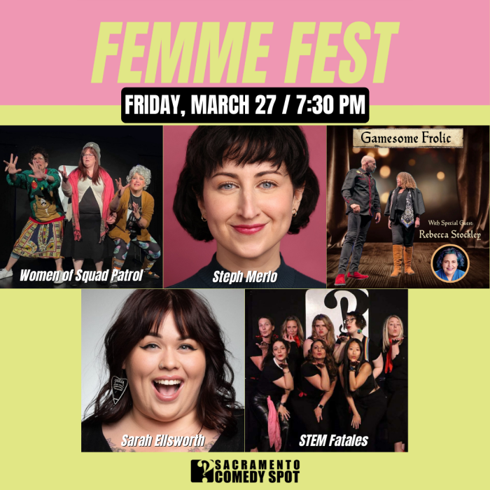 Night 1 of Femme Fest 2026 kicks off at 7:30pm with: Women of Squad Patrol, Steph Merlo, Gamesome Frolic, Sarah Ellsworth, STEM Fatales! Femme Fest returns March 27-29, 2026! Be seen. Be heard. Be unapologetically funny. Femme Fest is a three-day comedy festival celebrating and uplifting femme and femme-identifying comedians from across the United States, featuring stand-up, improv, and sketch comedy shows and comedy workshops. Our mission is to break barriers and create a supportive, empowering, and hilarious space where comedians from all over can showcase their talent. Through stand-up, improv, and sketch, Femme Fest amplifies the diverse, dynamic, and bold voices that shape the future of comedy. Laughter is power—and it’s time for femme voices to lead the way. This calendar listing is brought to you by Sacramento365, the region's one-stop, online calendar for arts and entertainment events, powered by Visit Sacramento and the City of Sacramento's Office of Arts and Culture (OAC).