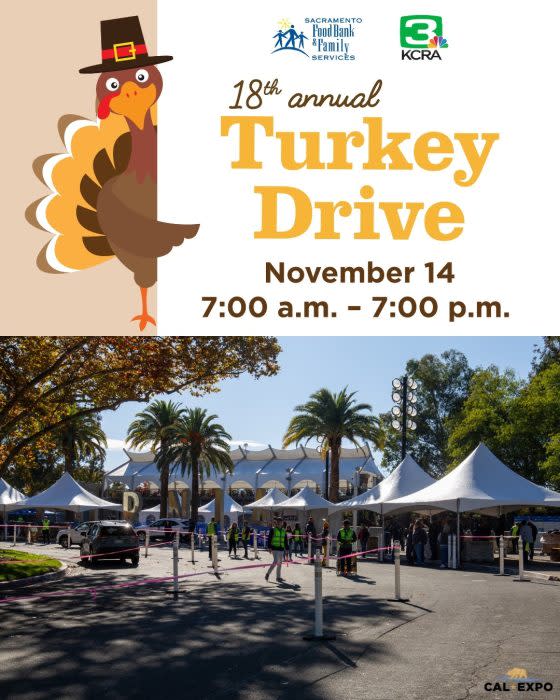 You can make an incredible difference in the lives of local families struggling to make ends meet by dropping off frozen turkeys and other essential holiday food items at the Cal Expo Main Gate Loop. There are two ways to help: 1. Drop your frozen turkey(s) at the Cal Expo Main Gate Loop. 2. Donate online by visiting sacramentofoodbank.org/turkeydrive. For every $20 donated, we can provide a family in need with a Thanksgiving turkey to enjoy.