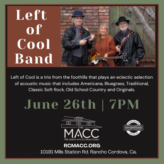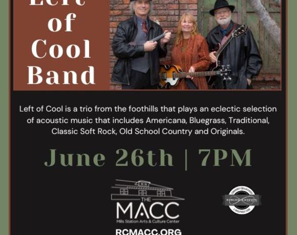 Mills Station Arts & Cultural Center (M.A.C.C.) is proud to host Left of Cool Band. This spousal duo has been singing and playing music together since they stumbled upon an open mic in the 80s. Inspired by the harmonies and instrumental excellence in Bluegrass, they’ve learned hundreds of songs together over the years, expanding their repertoire into Americana, Traditional, Folk, Old Country and some "Soft Rock" as well as home-grown originals. Hugh Hoeger is an accomplished musician on several stringed instruments including guitar, mandolin and bass. Hugh takes the lead in driving the unique Left of Cool sound with his distinctive flat-picking style on guitar and his soulful, authentic voice in singing. Sheri Hoeger is grateful to have woven music and visual arts into a sustainable creative lifestyle. In recent years, she has explored songwriting as another expressive outlet. Sheri enjoys sweet lead and harmony singing and keeping the low end solid on bass.