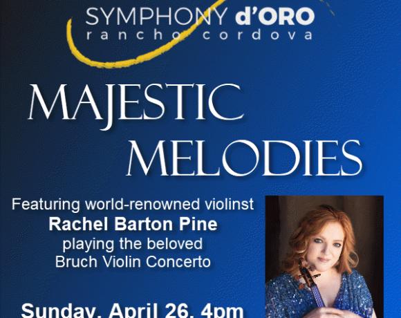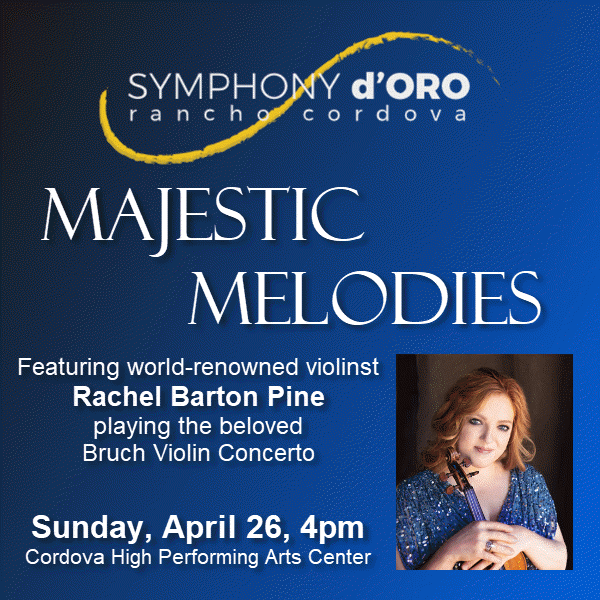 Symphony d'Oro will be joined at its April 26, 2026 concert by world-renowned violinst Rachel Barton Pine playing the beloved Bruch Violin Concerto. The concert will also feature the world premeire of the City Portraits Symphony by Symphony pianist and composer-in-residence Carlos McMillan-Fuentes, a comissioned work that features and celebrates the Rancho Cordova community. It promises to be an amazing concert for our community. This concert is also the Symphony's annual fundraiser that supports our offering free concerts the rest of the season. Tickets go on sale Sunday, February 15th, priced at $60/$50 per seat.