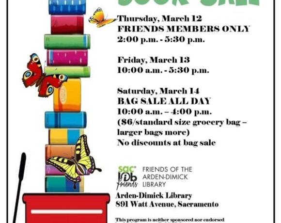 The Friends of Arden-Dimick Library are holding a two-day community book sale. Saturday, March 14 is a Bag Sale only; $6 gets you a standard sized grocery bag of gently used books (larger bags are more). You’re encouraged to bring your own grocery bags. Cash, credit or debit cards accepted. Current members of the Friends of the Library will receive a 20% discount (except on Saturday). Membership information will be available at the sale for those who wish to join the Friends or renew their membership. All sales will be held in the Community Room at the Arden-Dimick Library. Funds from this sale will be used to support library programs and services. On Thursday, March 12, there will be a preview sale for members of any affiliate branch of the Friends of the Sacramento Public Library. The sale will take place from 2pm-5:30pm in the Community Room. Members receive a 20% discount at this sale, and membership will be checked before purchase. You can join the Friends or renew your membership at this special event.