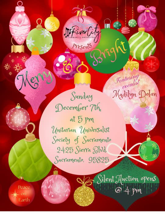 River City Community Orchestra presents "Merry & Bright," our Christmas Concert featuring Madilyn Dolan on vocals. Kid-friendly. Joyful seasonal music. We merge music from the present, past, and future. There will be ailent auction (it opens at 4 pm.) No admission fee; free parking. Audience members are invited to join orchestra members in cake and conversation following the concert. River City Community Orchestra is a 502(c)3 nonprofit. Donations are gratefully accepted.