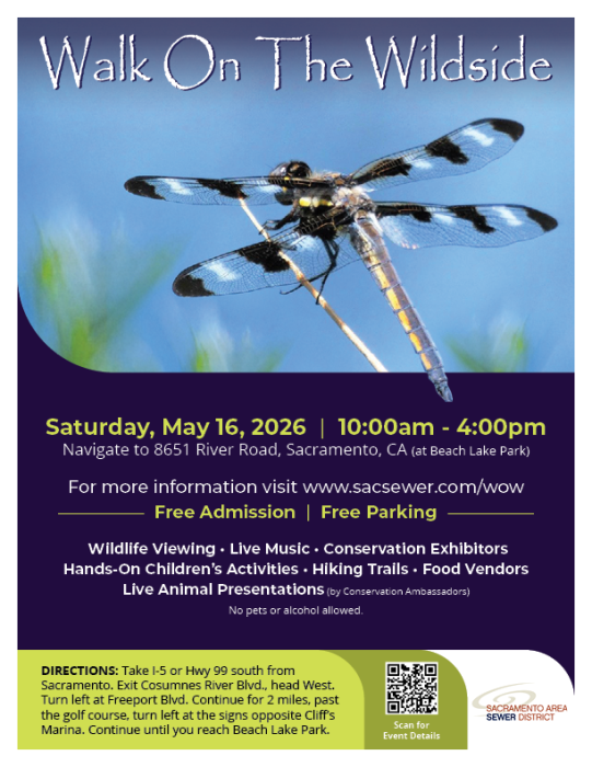 For over 30 years, this free family event attracts over 2,000 visitors who enjoy wildlife entertainment, exhibitors, vendors, self-guided tours of the SacSewer Bufferlands refuge, educational demonstrations & displays, children’s activities, food vendors, live music, and more! Walk on the Wildside is held outdoors in beautiful, lush surroundings bordered by riparian trees and nearby wetlands. Entry and parking are FREE.