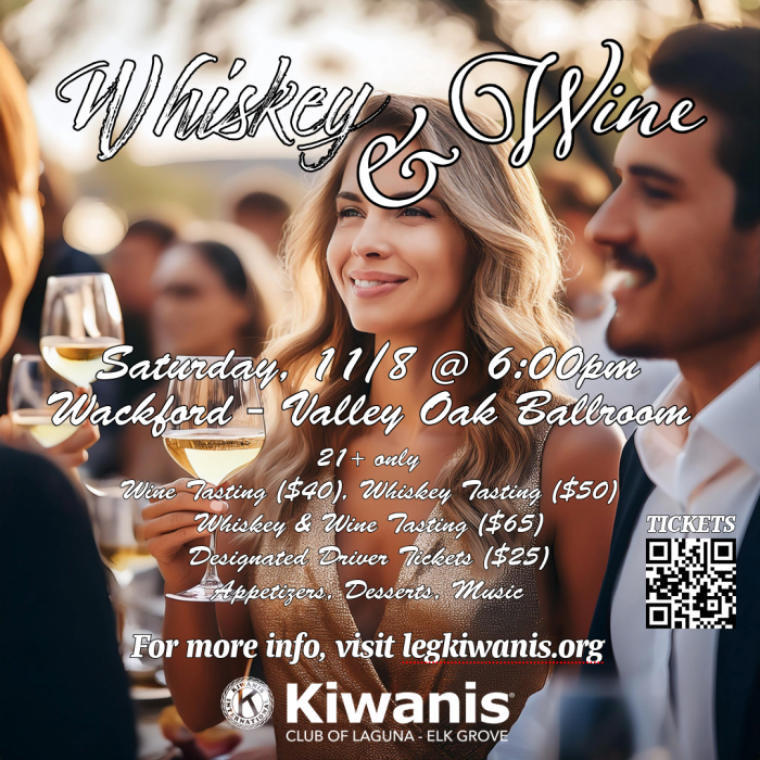 Experience an exquisite evening of whiskey and wine tasting paired with delicious appetizers & desserts, all for a charitable cause supporting kids. All tickets include non-alcoholic drinks, appetizers and dessert. You may choose from either whiskey tasting ($50), wine tasting ($40) or both ($65). Designated Driver tickets ($25). This is a 21+ event. Enjoy music, tastings and an evening filled with good friends and fun. Proceeds benefit the Kiwanis Club of Laguna-Elk Grove Foundation. We are a 501c3 non-profit, focused on serving the kids of our community. For questions or sponsorship opportunities, please email us at info@legkiwanis.org or visit our website legkiwanis.org.