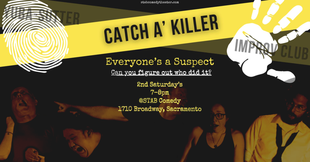 Improvisers from the Yuba-Sutter region are excited to launch their own murder mystery series “Catch A Killer”. This whodunnit style improv show relies solely on its audience to formulate a crime, location, and unique cast of characters. From there it’s up to the detective to put their skills to the test and see if they can unveil the true murderer or if they’ll live to kill another day. Audiences can also expect fun warm up games and opportunities for participation prior to each episode of “Catch a Killer”. Come join in the fun, if you dare! If you can't make it out in person -- don't worry, all of our Live, In person shows will be streamed through STAB! Comedy Theater TV on Twitch, YouTube and facebook live for free as always! (Though, you know, donations and virtual ticket purchases are always encouraged) Tune in at STABtv.com or https://www.stabcomedytheater.com/ https://www.twitch.tv/stabcomedy https://youtube.com/stabcomedytheater https://www.facebook.com/stabcomedytheater/ * We at STAB! are committed to the safest, most responsible accommodations possible. In respect to those around you, we expect you to conduct yourselves appropriately in a manner to protect your fellow attendees from any potential dangers. If you feel unwell, please, DO NOT ATTEND.